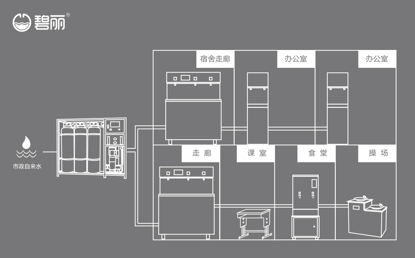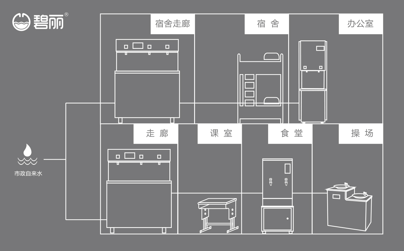 碧麗面向高校不同場(chǎng)景的飲水需求,提供多套整體飲水解決方案